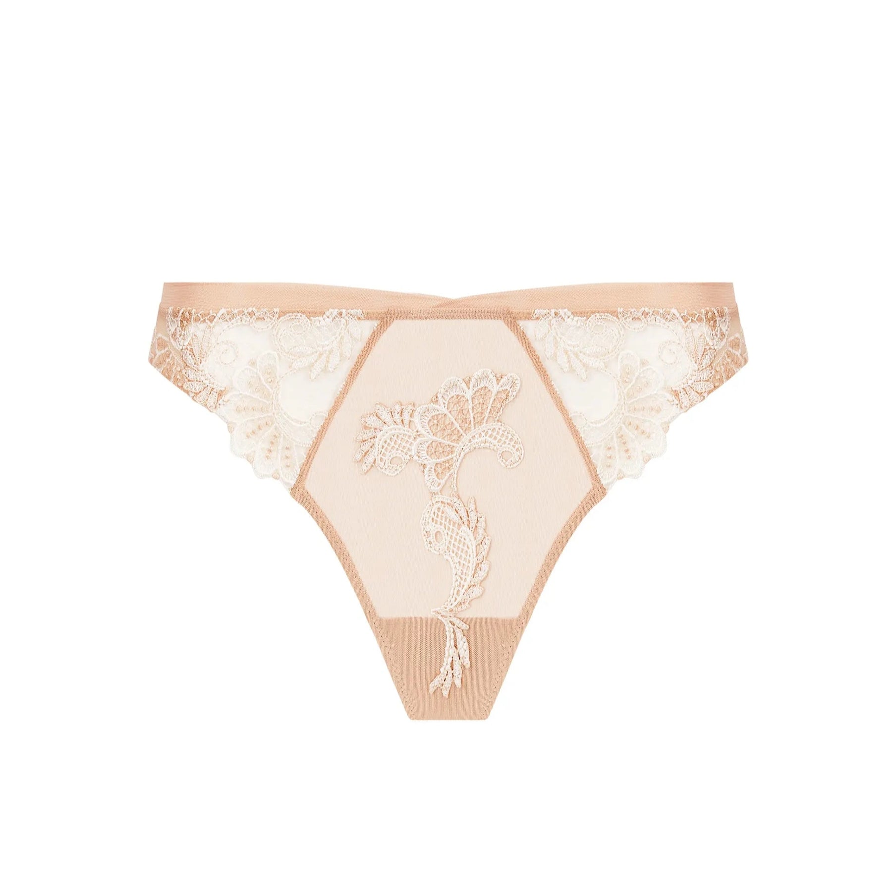 Tulle thong subtly reveals the cheeks. Tattoo-effect guipure insert. Delicate organza bow at center back. A pretty beige color enhanced by hints of pearly white, for an elegant silhouette.