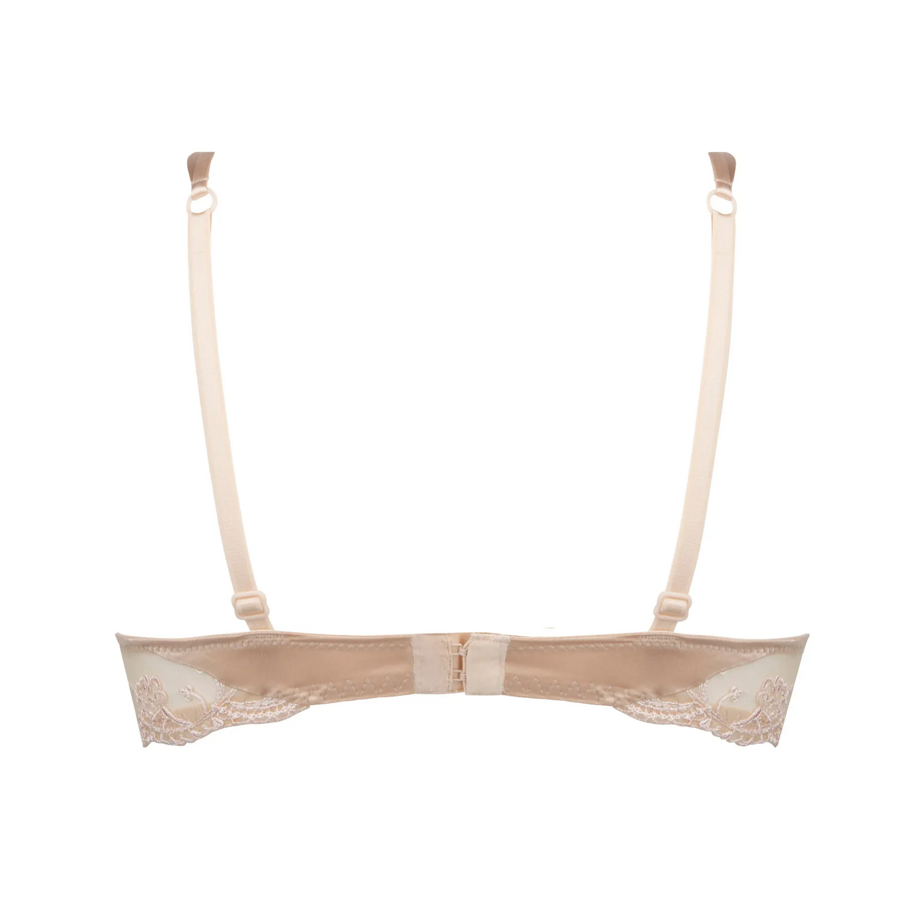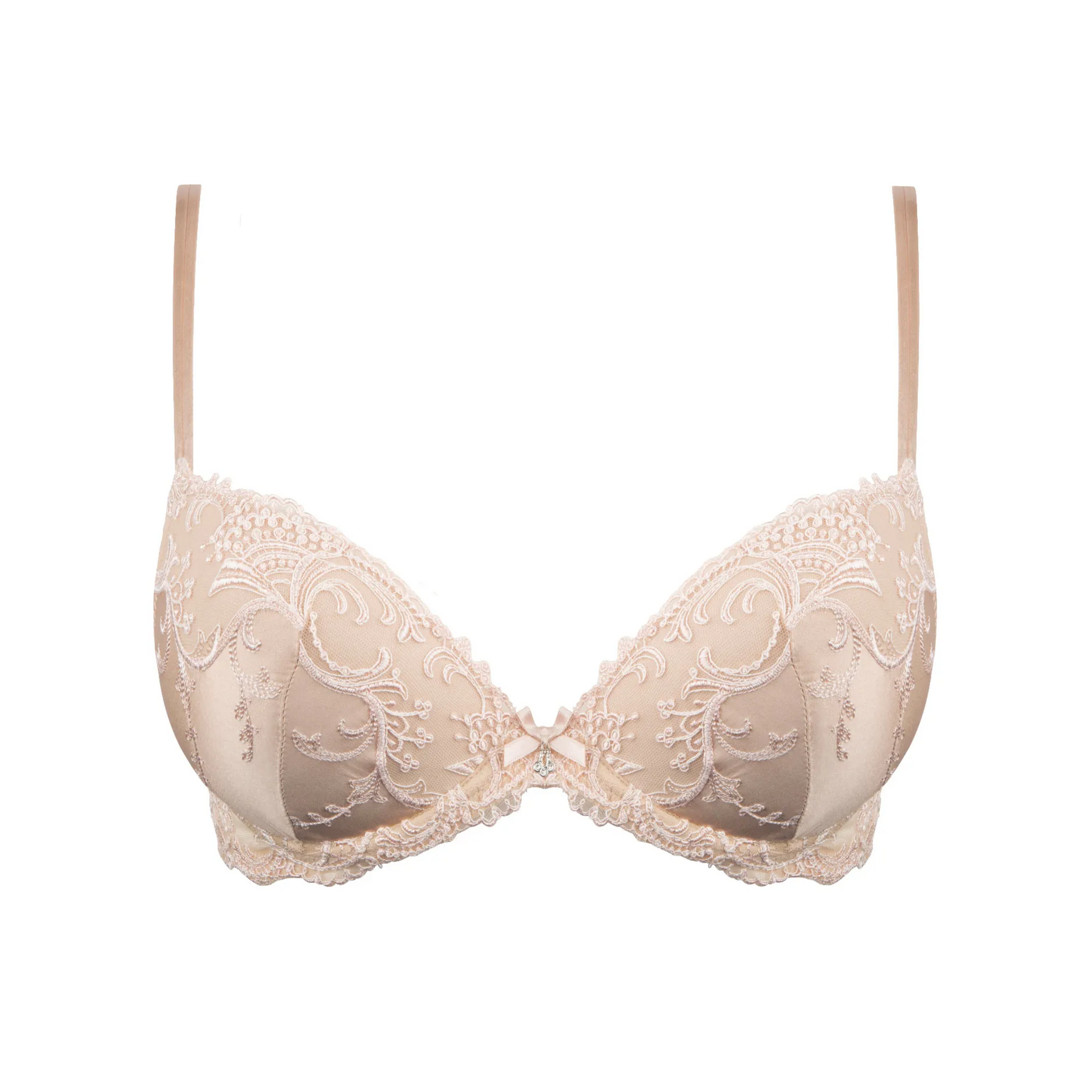 Underwired cup bra. This bra offers shapely, rounded breasts. Silk satin cups inlaid with embroidery on tulle. Slim, adjustable spaghetti straps adding lightness and femininity. Embroidered tulle back. Delicate satin bow and Swarovski rhinestone jewel at cleavage.
