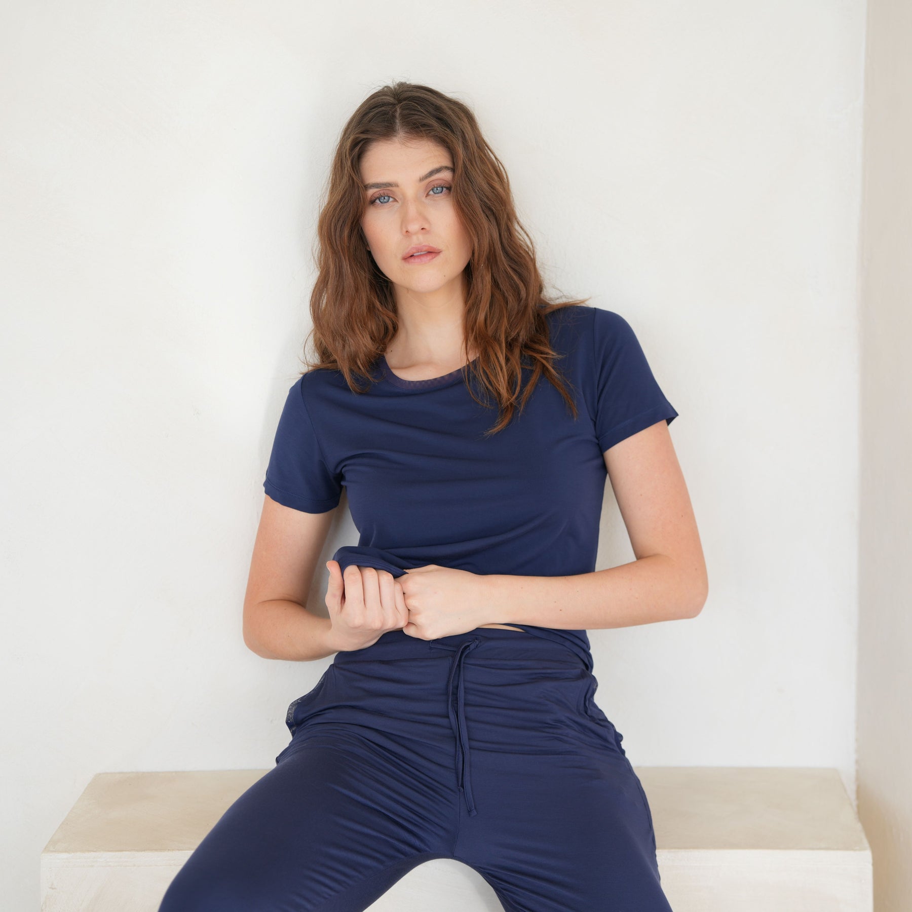 Featuring a crew neck style that flatters your natural shape. Our Douceur Soft™ Micro Modal drapes beautifully against your skin, while providing a sleek silhouette, complemented by a relaxed fit through the body for all-day comfort. Piping on the neckline adds a delicate, refined detail and simple classic t-shirt style throughout the body.