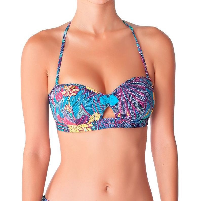 The Tropical Jungle Collection is for the girl who likes to to look effortlessly stylish with wild pops of color. Classic halter top style tie. Clasp closure. Cute bow detail in front with peephole opening. The perfect traveling companion for a last minute getaway! Love it? Match this bandeau top with your choice of 2 styles of bikini bottoms for the perfect set! Sized for the perfect fit. Bon voyage!