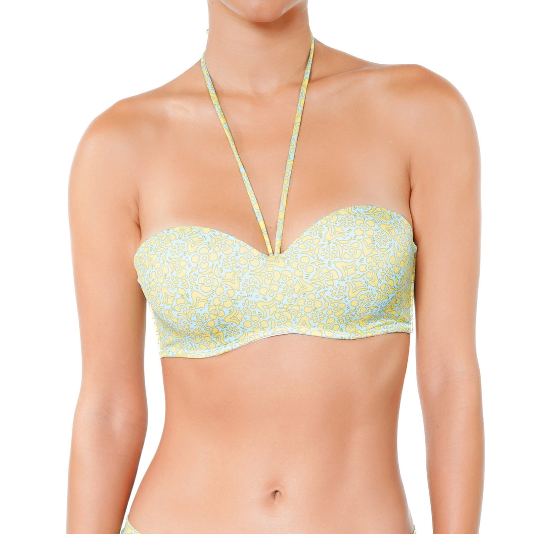 The new Citron Vert swimwear collection from Huit Paris embodies the essence of sun-soaked vibes with its vibrant hues and modern design. This bandeau features padding for added support and shape, ensuring a flattering silhouette. With removable straps, you have the flexibility to customize your look – wear it as a classic bandeau or opt for extra support with the straps. Ultra feminine shape ensures a comfortable fit while providing a flattering look to enhance your bust.
