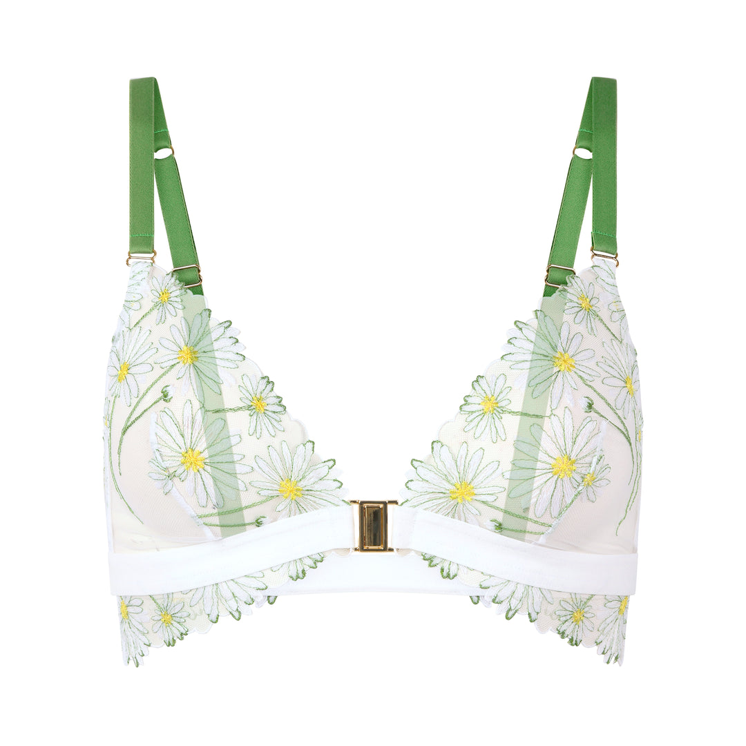 Discover this season's new collection Danse des Fleurs Bralette from Huit Paris. Crafted from the finest embroidered lace from Switzerland, this bralette provides a soft and breathable fit that feels gentle against your skin. This design offers light support and a natural shape, perfect for those seeking a comfortable yet stylish alternative to traditional bras. Detailed Daisy embroidery adorns the cups, and throughout including the underband. Vibrant green hue adjustable straps complete the look of this latest addition.