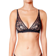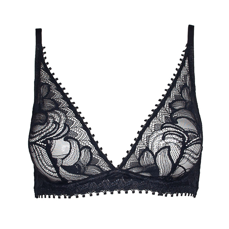 The defining feature of the new Nuit Folles bralette from Huit Lingerie is its exquisite lace construction. The intricate lace fabric, often chosen for its fine and delicate nature, envelops the cups and extends to the straps and band. The lacework showcases intricate floral motifs, creating a visually captivating and romantic appeal.