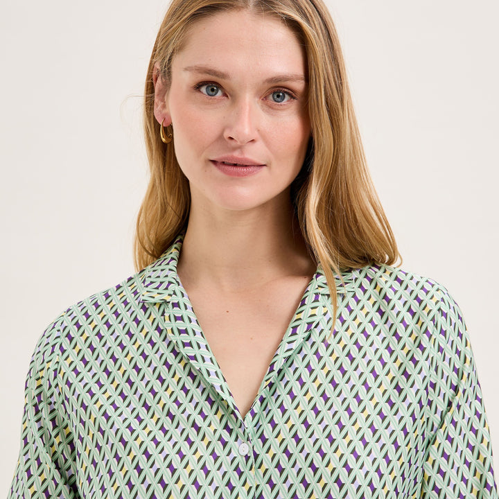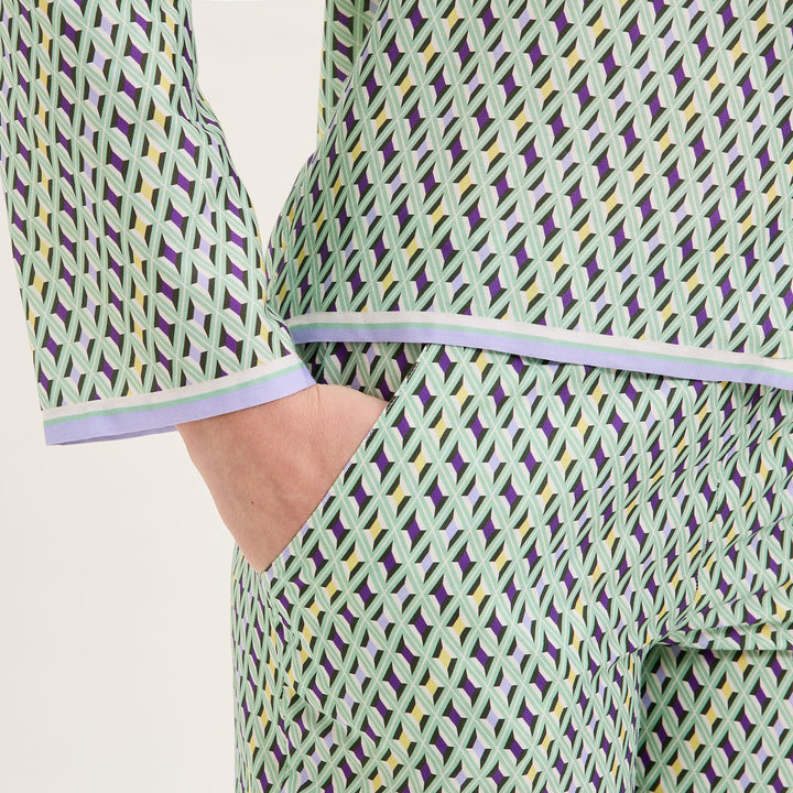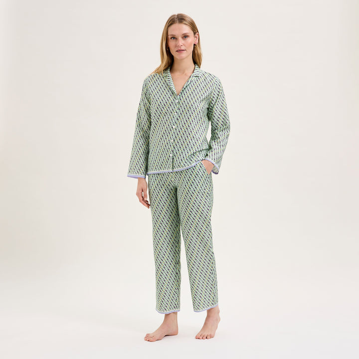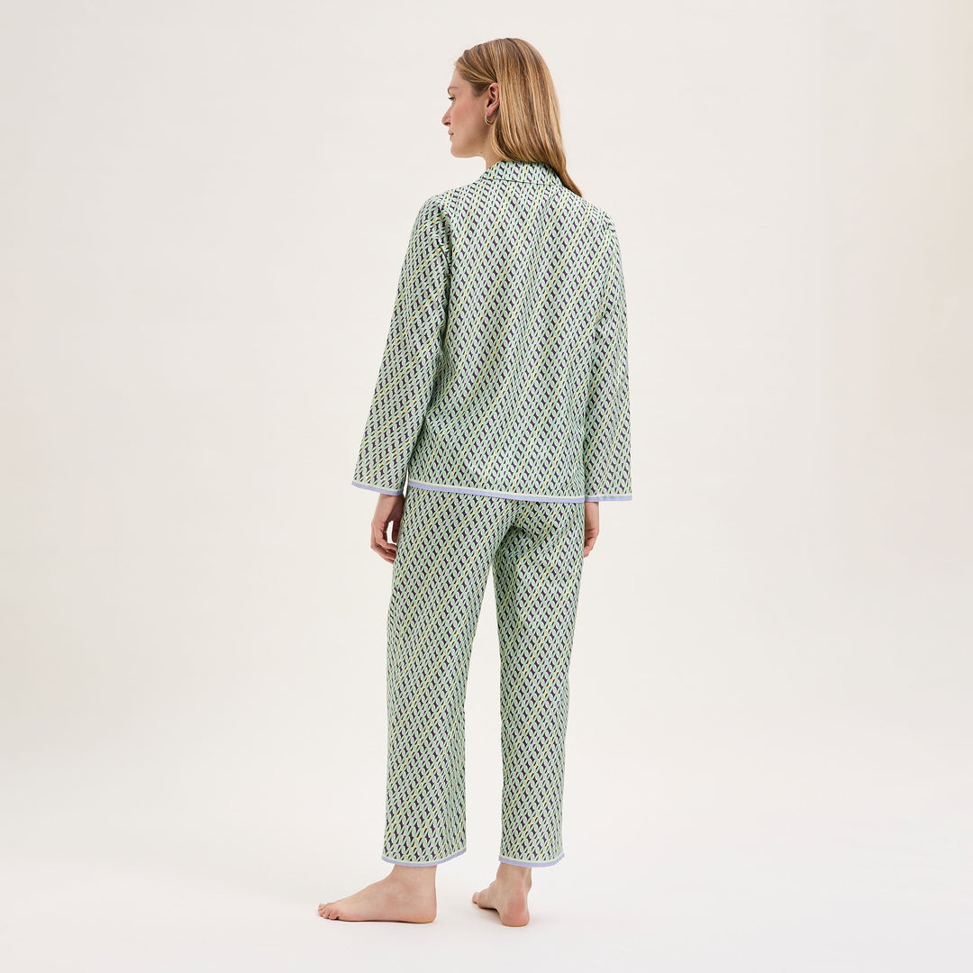 The new Camille pajamas from Laurence Tavernier is inspired by the motifs of Italian fashion houses. The graphic tie print combined with trendy masculine/feminine cuts offers you a unique style. Made from a luxurious cotton satin fabric. Breathable and lightweight. Perfect for the warmer summer nights.