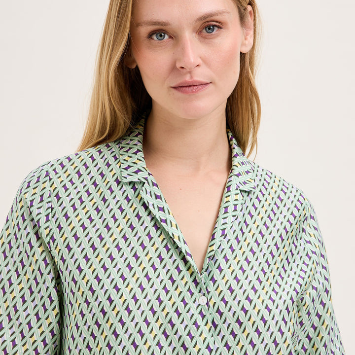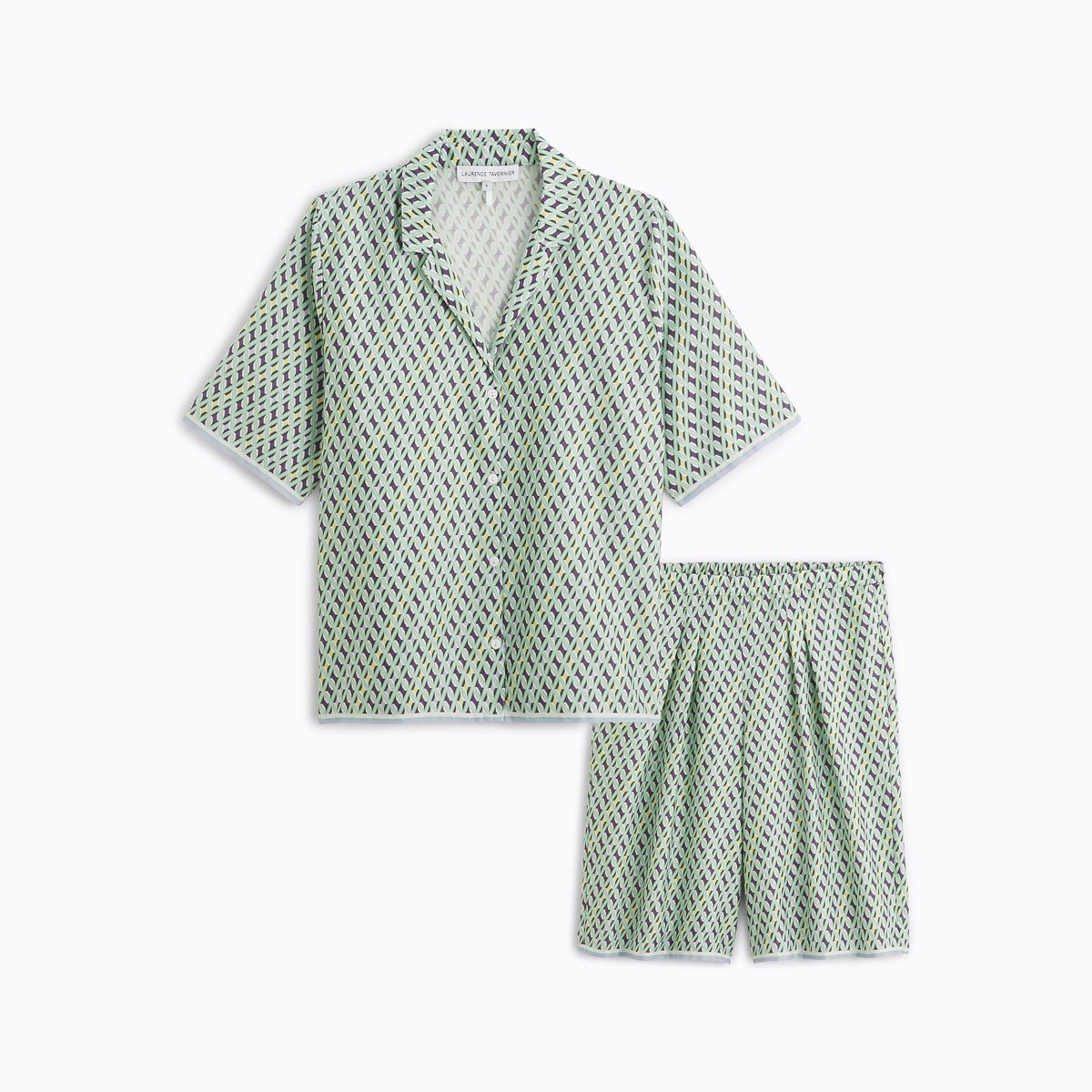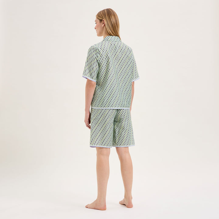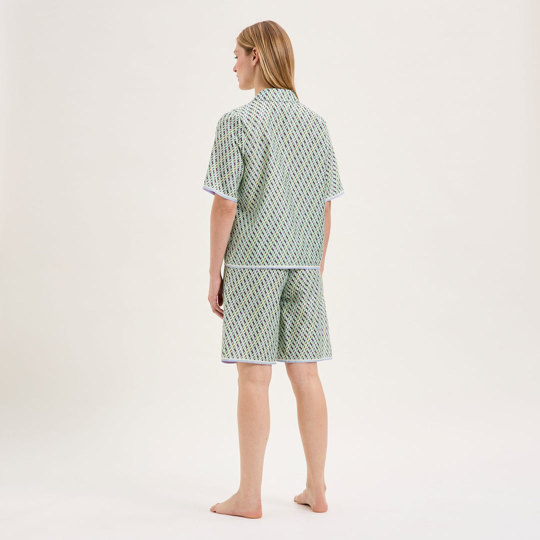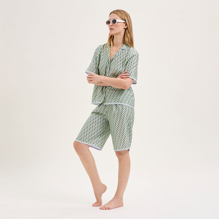 The new Camille line pajamas from Laurence Tavernier are inspired by the motifs of Italian fashion houses. Short sleeved set with Bermuda shorts. The graphic tie print combined with trendy masculine/feminine cuts offers you a unique style. Made from a luxurious cotton sateen fabric. Breathable and lightweight. Perfect for the warmer summer nights.