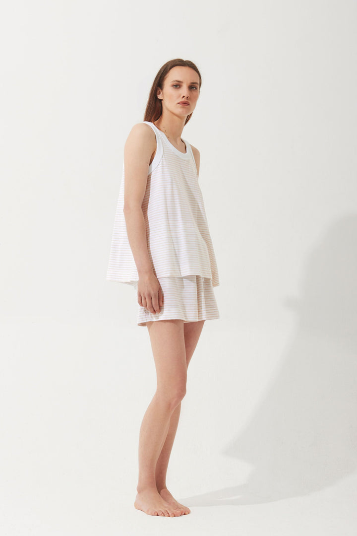 The sleeveless tank top features a flattering scoop neckline and a relaxed fit that allows for natural airflow, keeping you cool and comfortable all night long. Its minimalist design is elevated by refined finishes and subtle stripe detailing, creating a look that’s both polished and easygoing.